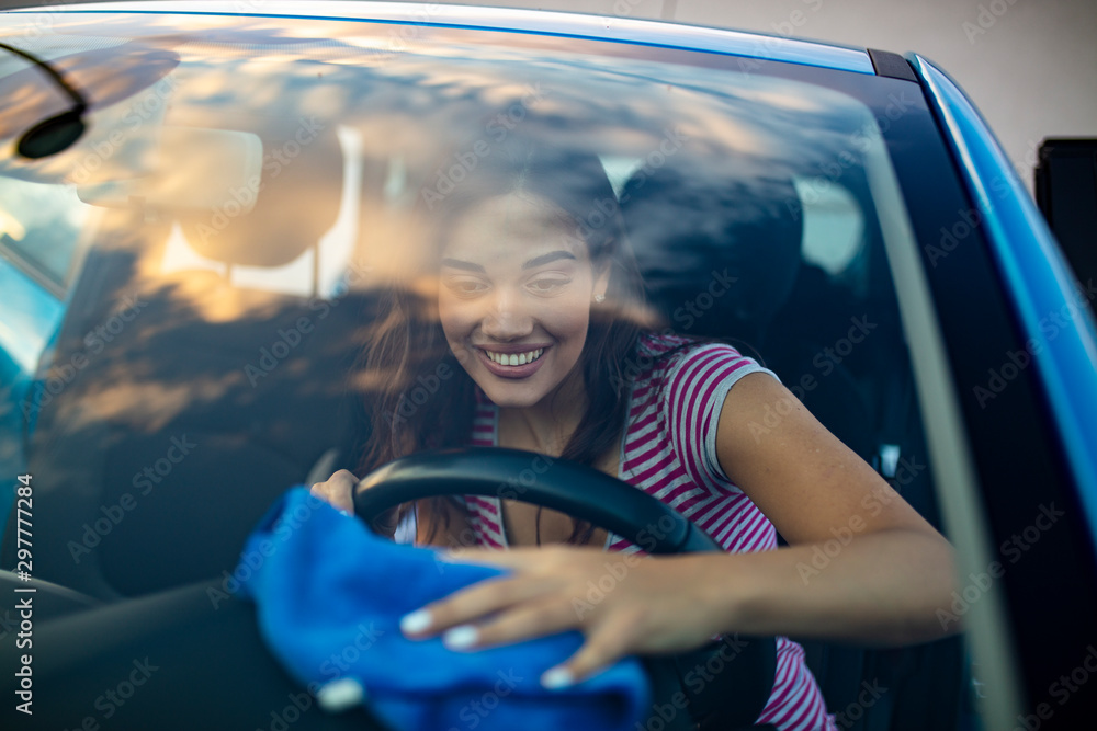 Transportation Self Service Care Concept Cleaning Car Interior Woman With Microfiber Cloth Cleaning Car Young Woman Driver Dry Wiping Her Car With Microfiber Cloth Cleaning Auto Stock Photo Adobe Stock